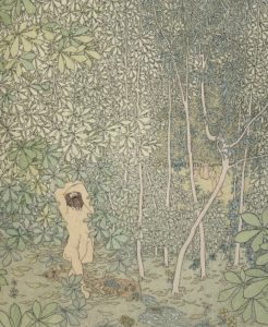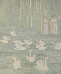 Splendide illustration, peut-être la plus emblématique du Symbolisme : « The immobility and static archelogical style of the poetry are matched by the pale, cool, lyrical coloring and formalized linear style of the illustrations – landscapes with classical figures rhythmically disposed » (The Turn of the Century, n°70).