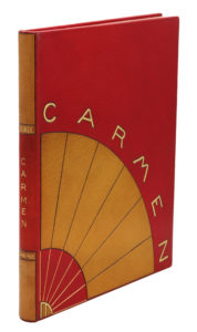 Paris, Cité des Livres, 1927. In-4 maroquin rouge, décor à l'éventail mosaïqué en maroquin citron sur les plats avec titre en lettres dorées, dos lisse mosaïqué avec titre doré, encadrement intérieur de même maroquin orné d'un double filet doré, doublure et gardes de moire rouge, couverture et dos, étui (Marie Eudes).Ouvrage illustré de 13 gravures sur bois en couleurs d'Hermann-Paul.