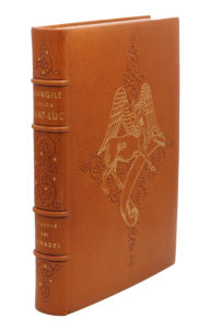 Paris, Pro Amicis, 1932. In-folio, maroquin lavallière, premier plat orné d'un taureau ailé frappé or sur fond d'arabesques garnies de fleuron poussé à froid, second plat décoré d'arabesques à froid, dos orné, doublure ornée de 2 lavis inédits de Chadel sur soie dorée, gardes de soie moirée, doubles gardes, tranches dorées sur témoins, couverture, étui-boîte postérieur (J. Chadel del. - G. Cretté succ. de Marius Michel).Édition illustrée de 84 bois en noir, gravés par Germaine de Coster et Savinienne Tourrette d'après les dessins de Jules Chadel, tirés à la main par Yoshijito Urushibara.