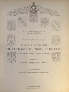 Armagnac del Cer (L. d’, Comte de Puymège) Les Vieux Noms de la France du Nord et de l'Est et les familles d'origine française en Europe. Préface du Professeur Pasteur Vallery-Radot. Paris, A la Vieille France, 1968. In-folio, broché.Couverture...