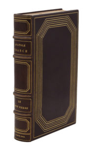 Paris, Les Éditions d’art Devambez, 1923. In-8, maroquin aubergine, plats ornés d'un encadrement de filet doré et de 6 filets formant un octogone doré, dos orné de même, doublure de maroquin violet avec encadrement d’un filet doré et forme octogonale de 3 filets dorés aux angles incurvés, gardes de moire violette, tranches dorées, couvertures et dos, étui (Augoyat 1929 – Lavoué).Édition illustrée d’un frontispice et de 9 compositions en couleurs, dont 8 hors texte et une couverture reprenant le frontispice en noir, le tout gravé à l’eau-forte par Pierre Brissaud.