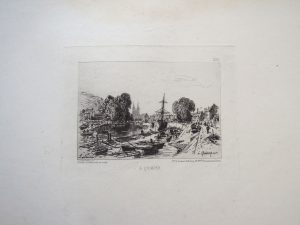 la route de Langoiran. 18 x 29,5 cm à l'assiette. Mouillures margi- nales, qq. rousseurs. • 4. Reste de la façade de l'Eglise Notre-Dame de la Grande-Sauve. 30 x 18,5 cm à l'assiette. Mouillures marginales, traces de cham- pignons en marge gauche. • 5. Abbaye de la Sauve vue de la Route de Bordeaux. 22 x 30 cm à l'assiette. Mouillures marginales avec traces de champignons en marge supérieure. • 6. Vue des absidioles nord de l'église de Notre-Dame de la Sauve. 26,5 x 21 cm à l'assiette; 31 x 43,5 cm toutes marges. Mouillures marginales avec traces de champignons en marge gauche. • 7. Absides de Notre-Dame de la Grande-Sauve vues du fond du jardin à l'est. 22 x 29 cm à l'assiette. Mouillures marginales avec traces de champignons en marge supérieure. • 8. Flanc sud de l'Abbaye de la Sauve-Majeure. 18 x 30 cm à l'assiette. Mouillures marginales avec traces de champignons en marge supérieure. • 9. Porte du cloìtre à la Sauve. 23,5 x 31 cm à l'assiette. Mouillures mar- ginales avec traces de champignons dans le bas de la planche. • 10. Intérieur de Notre-Dame de la Sauve. 30 x 20 cm à l'assiette. Mouillures marginales avec traces de champignons en marge gauche. • 11. Intérieur de la Grande-Sauve. 24 x 26 cm à l'assiette. Mouillures marginales avec traces de champignons en marge supérieure. • 12. intérieur de Notre-Dâme de la Grande Sauve (absides). 24 x 30 cm à l'assiette. Mouillures marginales touchant l'illustration. • 13. Détails de l'Abbaye de la Sauve. 33 x 24 cm à l'assiette. Mouillures marginales touchant l'illustration. • 14. Chevet de l'église Saint-Pierre à la Sauve. 18 x 32 cm à l'assiette. Mouillures marginales. • 15. Détails à l'église Saint-Pierre de la Sauve. 15 x 27,3 cm à l'assiette. Mouillures marginales. • 16. Croix du cimetière et église Saint-Pierre à la Sauve. 22,5 x 27 cm à l'assiette. Mouillures marginales avec traces de champignons en marge supérieure. • On joint 6 eaux-fortes diverses dont : Roses de Mai par Ch. Chaplin, Le Secret par Th. Aman, Au skating-ring par E. Gaujean, Quimper par Maxime Lalanne. Mouillures et traces de champignons marginales.