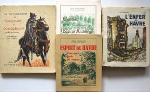hors texte. Quelques rousseurs. Édition originale tirée à 84 ex. h. c. et 1696 ex. numérotés dont celui-ci, un des 1295 ex. sur pur fil Johannot. Avec un envoi de l'auteur. • Esprit du Havre et ses aspects depuis ses origines. Le Havre, Imp. de la Presse, 1955. In-8, broché. Couverture illustrée. 290-(2) pp. et planches hors texte. Édition originale tirée à 600 ex. numérotés dont celui-ci, un des 340 ex. sur vélin bouffant avec un envoi de l'auteur sur le faux-titre. • La Vie Prodigieuse de Guillaume le Conquérant. Illustra- tions de A. Copieux. Rouen, Maugard, 1955. In-4, broché. Couverture illustrée (rousseurs). 150 pp. Illustré de bois gravés dans le texte et à pleine page. Édition tirée à 1000 exemplaires numérotés; celui-ci, non numéroté, avec un envoi de l'auteur sur le faux-titre. • Contes de la Bonne Auberge. Le Havre, Imp. de la Presse, 1955. In-8, broché. Couverture illustrée. 180 pp. Illustré de deux sonnets manuscrits en fac-similé et 23 croquis de l'auteur en hors texte. Édition originale tirée à 1000 ex. numérotés dont celui-ci, un des 150 ex. sur pur fil Lafuma avec un envoi de l'auteur sur le faux-titre.