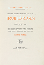 .1920-1921.. LIBRO: .(BIBLIOFILIA-LITERATURA CATALANA).. .MARTORELL, JOANOT:. .TIRANT LO BLANCH. Edició Anotada i Comentada per en Joan Givanel i Mas. Orles policromes per n´Eudald Canibell i Masbernat. Inicials, vinyetes i ex-libris d´en Germà Viader i Llor.. Sant Feliu de Guíxols: Estampa de n´Octavi Viader, 1920-21. 2 vol. en gran folio. I: 1 p. facsímil en negro de la edición de 1490, 1 p. en color + 177 fol. a dos tintas + 36 p. de índice. II: 1 facsímil de la edición de 1490 en negro, 1 p. color+ 203 fol. a dos tintas + 10 p. de índice a dos tintas. Ilustr. con capitales y culs-de-lampe; texto a dos columnas. 2 vol. enc. en pergamino decorado, corte superior dorado. Edición numerada de 460 ejemplares sobre papel de hilo con marca de aguas del impresor en cada pliego.
