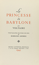 .1945.. LIBRO: .(BIBLIOFILIA-ENCUADERNACIÓN).. .VOLTAIRE; ANDREU, MARIANO [Ilustr.]:. .LA PRINCESSE DE BABYLONE.. Paris: Henri Lefebvre, 1945. 4º menor. 167 p. + 2 h. Bellamente ilustr. con 24 grabados al boj por Andreu. Enc. en rústica y carpeta editorial por M. ANDREU con petaca ilustrada. Traje de 475 ejemplares. Exlibris de anterior poseedor.