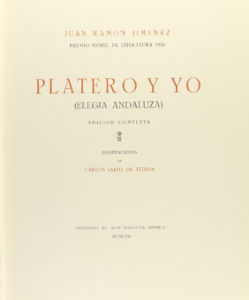 .1957.. LIBRO: .(BIBLIOFILIA).. .JIMÉNEZ, JUAN RAMON:. .PLATERO Y YO.. Vitoria: Ed. de arte Fournier, 1957. 4º mayor. 227 p. + 2 h. Ilustr. con dibujos en el texto por Carlos Saenz de Tejada. Enc. en guáflex, hierros dorados en ambos planos, presentado en petaca. Edición numerada de 500 ejemplares.