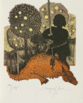 artista; una xilografía al pie de cada página acompaña el texto al largo de toda la obra. Edición numerada y nominada de 165 ejemplares sobre papel de hilo. Magnífica edición. Enc por Polliero Renato en plena piel con rueda y letrería dorada en el plano anterior y en seco en el posterior, nervios, con sobrecubierta y presentado en una petaca de tela y cartoné decorado a mano.
