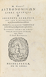 .1590.. LIBRO: .(CIENCIAS-ASTRONOMÍA).. .MANILII, M.:. .ASTRONOMICON LIBRI QUINQUE.. Heidelberg: Officina Sanctandreana, 1590. 8º menor. 8 h. + 136 p. + 4 h. [Sigue:] .SCALIGERI, IOSEPHI: ... COMMENTARIUS & CASTIGATIONES. .Id. 415 p. + 8 h....