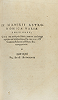 [Sigue:] .BITURIGIS, IUNI:... NOTUS. .131 p. + 2 h. Enc. en un vol. en pergamino reciente, lomera rotulada. Xilografías en el texto. Tipografía itálica y griega. Los cinco libros de Marcus Manilus, contemporáneo de Augusto y Tiberio, con la aportación y revisión que de él hace el médico Julio Cesar Scaliger (1484-1558).