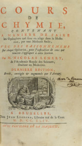 .1744.. LIBRO: .(CIENCIAS).. .LEMERY, NICOLAS:. .COURS DE CHYMIE, CONTENANT LA MANIERE DE FAIRE LES OPÉRATIONS QUI SONT EN USAGE DANS LA MEDECINE, PAR UN MÉTHODE FACILE.. Bruselles: Chez Jean Leonard, 1744. 8º mayor. 10 h. + 938 p. + 29 h. + 1 lám. Plegada. Ilustr. con grabados en el texto. Grabado calcográfico en la portada, a dos tintas. Las planchas calcográficas representan los aparatos de destilación y reflujo para plantas industriales, en la plegada los símbolos y los elementos y materias químicos. Texto con apostillas marginales. Marca manuscrita de antiguo poseedor. Buen ejemplar, limpio. Enc. en pergamino reciente, lomera rotulada.