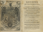 .1760.. LIBRO: .(CIENCIAS-MATEMÁTICAS).. .CERDA, THOMAS:. .LECCIONES DE MATHEMATICA, O ELEMENTOS GENERALES DE GEOMETRIA PARA EL USO DE LA CLASE.. Barcelona: Imp. Francisco Suriá, 1760. Frontis grabado por Francisco Boix + 7 h. + 264 p. + 16 lám. plegadas fuera del texto. Ilustr. con estados y fórmulas en el texto. Capitales y culs-de-lampe xilográficos. Ligera señal de óxido. Enc. en pergamino reciente, lomera rotulada. Además de la explicación de geometría plana y del espacio, incluye perspectivas de fortalezas y naves; geometría y trigonometría aplicada a la planimetría para la determinación de la altura de los edificios.