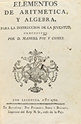 .1786.. LIBRO: .(CIENCIAS-ARITMÉTICA).. .POY Y COMES, MANUEL:. .ELEMENTOS DE ARITMETICA, Y ALGEBRA PARA LA INSTRUCCION DE LA JUVENTUD.. Barcelona: Francisco Suria y Burgada, Imp. del Rey, 1786. 8º. 5 h. + 270 p.+ 2 h. Ilustr. frontispicio y algunos ejemplos matemáticos. [Sigue:] .RUDIMENTOS DE LA RAZON Y PROPORCION EN COMUN Y EN PARTICULAR, CON APLICACION DEL ALGEBRA A VARIAS QUESTIONES DE COMERCIO. .Id. 5 h. + 230 p. + 2 h. Con tablas y estados en el texto. Dos obras juntas enc. en pergamino reciente, lomera rotulada. Palau 234421.