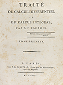 .1797.. LIBRO: .(CIENCIAS-MATEMÁTICAS).. .LACROIX, S. F.:. .TRAITÉ DU CALCUL DIFFÉRENTIEL ET DU CALCUL INTÉGRAL.. Paris: Cehz J. B. M. Duprat, 1797-1798. 2 vol. en 4º mayor. I: 3 h. + XXXII + 519 p. + 4 lám. plegadas. II: 1 h. + VIII + 732 p. + 8 p. + 5 lám. plegadas. Numerosas fórmulas y explicaciones matemáticas. Algún pliego tostado pero en general limpio. Dos vol. enc. en pasta española de época, doble tejuelo, cortes pintados. A pesar de su origen humilde y gracias al esfuerzo de su familia, Lacroix supo hacerse un nombre dentro de la sociedad científica matemática y tuvo una larga trayectoria como docente, legando textos importantes como el que presentamos, que han sido usados durante decácadas en universidades europeas.