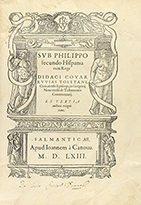 .1563.. LIBRO: .(DERECHO).. .COVARRUVIAS TOLETANI, DIDACI:. .SUB PHIILIPPO SECUNDO HISPANIARUM REGE.. Salmanticae: Apud Ioannem à Canova, 1563. 4º mayor. 10 h. + 155 fol. + 2 h. Enc. en pergamino de época. Con la última h. con el colofón y marca xilografiada del impresor verso. Texto a dos columnas, con todos sus márgenes, con alguna antigua anotación marginal de época o antiguo subrayado. Alguna galería ocasional en los márgenes. Ligero cerco de humedad. Su autor fue catedrático de derecho en la universidad de Salamanca y tuvo un papel destacado en el concilio de Trento, se alineó con de las Casas en contra de la esclavitud de los aborígenes. CCPB 250097-3.
