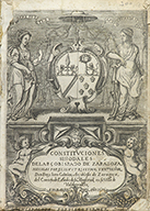 Pequeña falta en la punta de la portada. Lleva un pliego de 4 h. impreso en 1657 con texto de Juan Cebrian, en recto de A4 reza ´Por mandado de su Exc. el Arçobispo mi Señor Geronimo Perez Navarro Not.´, algo sucias. Capitales xilográficas, texto con apostilla marginales. Ejemplar manoseado. Cercos de humedad a lo largo de toda la obra, así como finas galerías marginales, no afectan caja de texto. Enc. en pergamino de época, con restos de cierres de badana, mareado. CCPB 38748-7 para las constituciones y 601707-X para el folleto final. Palau 59915.