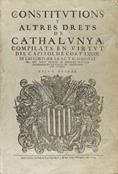 M. DCCII. [SIGUE CON PORTADA PROPIA:] PRAGMATICAS Y ALTRES DRETS DE CATHALUNYA, COMPILATS EN VIRTUT DEL CAP. DE CORT XXIV, DE LES CORTS PER LA S. C. Y REAL MAIESTAT DEL REY DON PHILIP NOSTRE SENYOR CELEBRADES EN LA VILA DE MONTSO ANY M.D.LXXXV. Y NOVAMENT REIMPRESAS CONFORME LA DISPOSICIÓN DEL CAPITOL LXXXII DE LES CORTS CELEBRADAS EN LA CIUTAT DE BARCELONA ANY M. DCC.II. [SIGUE CON PORTADA PROPIA:] CONSTITUTIONS Y ALTRES DRETS DE CATHALUNYA, SUPERFLUOS, CONTRARIS, Y CORREGITS, COMPILATS EN VIRTUT DEL CAP. DE CORT XXIIII, DE LES CORTS PER LA S. C. Y R. MAJESTAT DEL REY DON PHILIP NOSTRE SENIOR CELEBRADES EN LA VILA DE MONTSÓ, ANY M. D. LXXXV.. Barcelona: en casa de Joan Pau Martí, y Joseph Llopis Estampers, 1704. 3 partes en 1 vol. en folio mayor. I: 22 h. + 513 p. + 1 h. en blanco + 22 h. Repertori Alphabetic. II: 2 h. + 213 p. + 3 h. III: 2 h. + 90 p. + 1 h. de erratas. Cada una de las tres partes con portadas propias y con un gran escudo de Catalunya xilografiado. Conserva todos los márgenes. Alguna hoja tostada y esporádicos puntos de óxido; pequeña rasgadura marginal en tres hojas iniciales; fina galería en la esquina superior del tomo III de la p. 123 a la 164 y al final de la obra; falta de papel en la esquina inferior de la última p., no afecta texto. Enc. en pleno pergamino de época, nervios. Edición original de esta compilación de las Constituciones de Catalunya. Fue impreso cuidadosamente en grueso papel con un magnífico diseño de las capitulares (de diferentes tamaños), texto a dos columnas. Palau 60361, dice que esta es la edición más buscada por los estudiosos, por ser la más completa, la dificultad de hallarla impulsó al Colegio de Abogados a editar un facsímil en 1909. Es además, el libro más voluminoso publicado en lengua catalana hasta la fecha. Aguiló 1321.