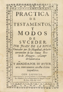 .1718.. LIBRO: .(DERECHO).. .RIPIA, JUAN DE LA:. .PRACTICA DE TESTAMENTOS Y MODOS DE SUCEDER. Por..., Contador de su Magestad, de la intervención de las rentas Reales de Almagro, y Campo de Calatrava.... Madrid: Imp. de Angel Pasqual Rubio, 1718....
