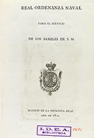 .1802.. LIBRO: .(MARINA DE GUERRA-LEGISLACIÓN).. .REAL ORDENANZA NAVAL PARA EL SERVICIO DE LOS BAXELES DE S. M.. Madrid: Imp. Real, 1802. 4 h. + 507 p. + 1 h. + 5 estados., 4 de ellos plagados. Portada con escudo calcográfico. Texto con apostillas marginales. Algunas páginas tostadas. Sello húmedo de antigua biblioteca. Enc. en pasta española de época, algo rozada, tejuelo.