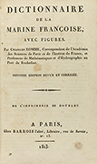 .1813.. LIBRO: .(NÁUTICA).. .ROMME, CHARLES:. .DICTIONNAIRE DE LA MARINE FRANÇOISE, avec figures. Par.... Paris: Imp. de Doublet, 1813. 8º mayor. VIII + 564 p. + 7 lám. calcográficas plegadas. Algo de óxido y algún pliego tostado. Enc. en...