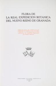 Enc. en media piel, puntas. Edición dirigida y promovida por Jose Celestino Mutis. Constituye la edición científica colombiana más importante del siglo XVIII. Los volúmenes se organizan por familias botánicas, y contienen láminas de plantas cuya reproducción se caracteriza por una gran fidelidad en los detalles, colorido y extraordinaria belleza.