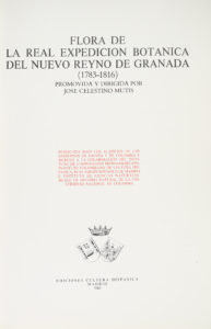 .1985-1989.. LIBRO: .(FACSÍMIL).. .FLORA DE LA REAL EXPLORACION BOTANICA DEL NUEVO REINO DE GRANADA.. Madrid: Ediciones Cultura Hispanica, 1985-1989. 4 vol. en gran folio. Comprende los vol. IX (2), XXIII, XV (2), XXVII. Enc. en media piel, puntas. Edición dirigida y promovida por Jose Celestino Mutis. Constituye la edición científica colombiana más importante del siglo XVIII. Los volúmenes se organizan por familias botánicas, y contienen láminas de plantas cuya reproducción se caracteriza por una gran fidelidad en los detalles, colorido y extraordinaria belleza. Algunos vols. encuadernados en media piel, puntas, otros sin encuadernar.