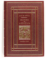.2001.. LIBRO: .(FACSÍMIL).. .CALERO, FRANCISCO:. .COMPENDIO DE MEDICINA. Junto a otros tratados compuestos por diversos doctores. Traducción de la edición latina impresa en Venecia, 1500 por... Introducción por Valentín Moreno.. Madrid: Guillermo Bláquez, 2001. 2 vol. en 4º. I. Facsímil. 150 h. aprox. II. Libro de cometarios. 143 p. + 2 h. . Dos vol. enc. en terciopelo, dorados en ambos planos; presentados en petaca. Tiraje de 750 ejemplares.
