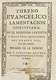 .1677.. FOLLETO: .ESCUELA, FR. GERONIMO:. .THRENO EVANGELICO, LAMENTACION CHRISTIANA: EN EL SACRIFICIO CRUENTO, MARTYRIO PROTOTYPICO DEL HOMBRE DIOS N. S. IESU CHRISTO.. [Zaragoza]: Imp. Iuan de Ybar, 1677. 8º. 29 h. (Sign. A8-H1). Portada en orla...