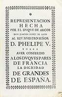 .1730 ca.. FOLLETO: .REPRESENTACION HECHA POR EL DUQUE DE ARCOS DON JOACHIM PONCE DE LEON AL REY NUESTRO SEÑOR D. PHELIPE V. SOBRE AVER CONFERIDO A LOS DUQUES PARES DE FRANCIA LA DIGNIDAD DE GRANDES DE ESPAÑA.. S.l.s.imp.n.a., 1730 ca. 4º mayor. 6...