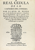 .1773 y 1775.. FOLLETO: .(CÉDULA REAL).. .REAL ORDENANZA ADICIONAL A LA DE REEMPLAZOS DE TRES DE NOVIEMBRE DE 1770.... Madrid: Imp. Pedro Marin, 1773. 4º mayor. 39 p. Escudo en la portada. [Más:] .REAL CEDULA DE S. M. Y SEÑORES DEL CONSEJO, POR LA QUAL SE MANDA OBSERVAR (...) LA REAL ORDENANZA ADICIONAL À LA DE REEMPLAZOS DEL EGERCITO (...) . .Id.4 h. [Más:] .REAL CEDULA DE S. M. ... POR LA QUAL SE MANDA POR VIA DE DECLARACION GENERAL, Á BENEFICIO DE LAS MANUFACTURAS, QUE SE GUARDE Á LOS MAESTRO TINTOREROS, Y TORCEDORES DE SEDA, Y LANA DE ESTOS REYNOS.... Id., 1775. 3 h. + 1 b.