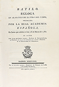 .1780.. FOLLETO: .MELÉNDEZ VALDES, JUAN:. .BATILO. ÉGLOGA EN ALABANZA DE LA VIDA DEL CAMPO, PREMIADA POR LA REAL ACADEMIA ESPAÑOLA, EN JUNTA QUE CELEBRÓ EL DIA 18 DE MARZO DE 1780.. Madrid: Imp. Joachín Ibarra, 1780. 4º. 1 h. + 24 p. Sin...