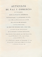 .1783.. FOLLETO: .BOULIGNY, JUAND DE:. .ARTÍCULOS DE PAZ Y COMERCIO AJUSTADOS CON LA PUERTA OTOMANA, EN CONSTANTINOPLA Á 14 DE SEPTIEMBRE DE 1782.. [Madrid]: Imp. Real, 1783. 8º mayor. 30 p. Gran escudo real xilografiado en la primera h. Sin cubiertas.
