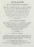 .1823.. FOLLETO: .(VICH-HOSTALRICH).. .XARRIÉ, FRANCISCO:. .RELACION DE LAS SOLEMNES EXEQUIAS QUE EN LA IGLESIA DE NTRA. SRA. DE LA PIEDAD DE LA CIUDAD DE VICH... EN MEMORIA (...) DE DON ANTONIO COLL, MUERTO EN GERONA DE RESULTAS DE UNA HERIDA RECIBIDA EN EL BLOQUÉO DEL FUERTE DE HOSTALRICH.. Vich: Oficina Ignacio Valls, 1823. 8º. 8 h. + 20 p. Sin cubiertas.