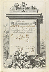 Bellas acciones de comercio ilustradas calcográficamente con motivos de comercio y ciencias naturales. El diseño y dibujo es de Acuña. Numeración consecutiva. Texto manuscrito de época referente a la propiedad del Marqués de Grimaldo. Antiguas señales de doblez.