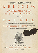 .1685.. LIBRO: .(HISTORIA ROMA-NUMISMÁTICA).. .CHOUL, GUILLERMO:. .VETERUM ROMANORUM. RELIGIO, CASTRAMENTATIO DISCIPLINA MILITARIS UT BALNEAE. Ex antiquis numismatibus & lapidibus demonstrata.. Amstelaedami: Apud onio Waesbegios, 1685. 8º mayor. 4...