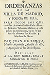 .1763.. LIBRO: .(HISTORIA-MADRID).. .TORIJA, JUAN:. .ORDENANZAS DE LA VILLA DE MADRID Y POLICIA DE ELLA PARA TODOS LOS QUE ESTUVIESEN Ó ADMINISTRASSEN CASA, HUERTAS Y JARDINES, TAHONAS, MOLINOS Y TODO GENERO DE POSSESSIONES.... Madrid: Imp. de D. Antonio Mayoral, 1763. 8º menor. 12 h. + 143 p. Cabeceras y capitales xilográficas. Enc. en pleno pergamino de época, algo mareado. Esporádicos puntos de óxido. CCPB 571773-6.