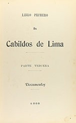 .1888.. LIBRO: .(HISTORIA-PERÚ).. .LIBRO PRIMERO DE CABILDOS DE LIMA. Parte tercera. Documentos.. Paris: Imp. Paul Dupon, 1888. Folio. 4 h. + 222 p. + 4 lám. cromolitográficas. Tercer vol. de un total de tres. taladro y óxido intermitente y marginal, no afecta texto. Enc. en media piel, pequeña galería en la lomera.