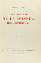 .1956.. LIBRO: .(NUMISMÁTICA).. .BUNZIO, HUMBERTO:. .DICCIONARIO DE LA MONEDA HISPANOAMERICANA.. Santiago de Chile: Ed. Fondo Histórico y Bibliográfico José Toribio Medina, 1956. 2 vol. en folio menor, sin el vol. de las lám. I: XIX + 327 p. + 1 h. II: 454 p. + 2 h. Dos vol. enc. en media piel, nervios y dorados en la lomera; conserva las cubiertas originales.