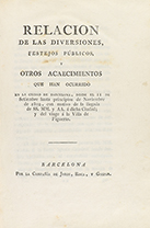 .1802.. LIBRO: .(LOCAL-BARCELONA).. .PLANELLA [GRABADOR]:. .RELACION DE LAS DIVERSIONES, FESTEJOS PUBLICOS Y OTROS ACAECIMIENTOS QUE HAN OCURRIDO EN LA CIUDAD DE BARCELONA, desde el 11 de Setiembre hasta principios de Noviembre de 1802, con motivo de...