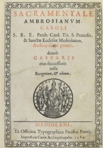 .1589.. LIBRO: .(HUMANIDADES).. .CAROLI, AMBROSIUM:. .SACRAMENTALE.. Mediolani [Milán]: Typ. Pacifici Pontii, 1589. 8º. 6 h. + 354 p. Capitales y culs-de-lampe xilografiados. Texto a dos tintas, con partituras musicales en notación cuadrada sobre tetragrama. Tres últimas hojas remarginadas, portada a dos tintas, remontada. Corto de margen superior, alguna restauración. Enc. en pergamino reciente, lomera rotulada.