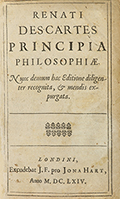 .1664.. LIBRO: .(FILOSOFÍA).. .DESCARTES, RENATI:. .PRINCIPIA PHILOSOPHIAE.. Londini: Ex. J. F. pro Jona Hart, 1664. 3 partes en un vol. en 8º menor. I: 16 h. + 176 p. II: .DISSERTATIO DE METHODO. .Id. 8 h. + 199 p. + 7 lám. plegadas, 5 son facsímil. III: .PASSIONES ANIMAE. .Id. 9 h. + 80 p. +3 h. Corto de márgenes. Texto con apostillas marginales. Tres partes enc. en pergamino de época en un vol. cortes pintados. Descartes fue el primer filósofo europeo en escribir en lengua vulgar, tenía gran interés en que todos le entendieran, está considerado el padre de la filosofía moderna.