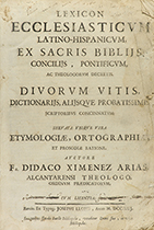 .1713.. LIBRO: .(LÉXICO- ECLESIÁSTICO).. .XIMENEZ ARIAS, DIDACO:. .LEXICON ECCLESIASTICUM LATINO-HISPANICUM, EX SACRIS BIBLIIS CONCILIIS, PONTIFICUM, THEOLOGORUM DECRETIS. DIVORUM VITIS, DICTIONARIIS, ALIISQUE PROBATISSIMIS SCRIPTORIBUS CONCINNATUM.. Barcin.: Typ. Josephis Llopis, 1713. 4º mayor. 4 h. + 403 p. Texto a dos columnas. Ejemplar mareado, con óxido y papel debilitado en las primeras hh. alguna antigua anotación manuscrita. Enc. en pergamino de época, con anotaciones en los planos y pequeña pérdida en el margen del plano anterior.