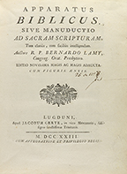 .1723.. LIBRO: .(RELIGIÓN).. .LAMY, BERNARDO:. .APPARATUS BIBLICUS SIVE MANUDUCTIO AD SACRAM SCRIPTURAM.. Lugduni: apud Jacobum Certe, 1723. 4º. 10 h. + 422 p. + 31 h. + 23 lám. calcográficas. Portada con marca xilográfica. Ilustr. con bonitas cabeceras, capitales y culs-de-lap xilografiadas más 12 lám. plegadas, formadas por mapas, planos, estados, gráficos e ilustraciones, intercaladas en el texto más 11 lám. a plena página de fauna y flora, dispuestas al final. Algunas de las lám. plegadas presentan una rasgadura en el margen interior. Texto con apostillas marginales. Algún punto de óxido al inicio de la obra. Enc. de época en pergamino, lomera rotulada. Anotaciones manuscritas de antiguo poseedor.