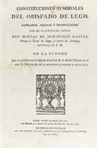 .1803.. LIBRO: .(RELIGIÓN-LUGO).. .MORATINOS SANTOS, MATÍAS DE:. .CONSTITUCIONES SYNODALES DEL OBISPADO DE LUGO, COPILADAS, HECHAS Y PROMULGADAS POR EL ILLUSTRISIMO SEÑOR.... Santiago: Imp. Ignacio Aguayo, 1803. 4º mayor. 8 h. + 311 p. Capitales y cabeceras xilografiadas. Texto con apostillas marginales. Fina galería en el margen interior de algunas hojas, no afecta caja de texto. Enc. en pergamino de época. Ex-libris estampillado.
