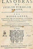 .1641.. LIBRO: .(LITERATURA CLÁSICA).. .VIRGILIO MARON, PUBLIO:. .LAS OBRAS DE PUBLIO VIRGILIO MARON, traducido en prosa castellana por Diego Lopez.... Madrid: Imp. de Francisco Martinez, 1641 (en portada y colofón). 8º. 4 h. + 304 fol. Portada con grabado tipográfico. Falto del fol. 1. Pequeña falta en la esquina inferior de la portada, abrasión en el fol. 192 con pequeña pérdida; ténue cerco de humedad. Enc. con la lomera en piel y papel al agua, lomera algo rozada. CCPB 37678-7.