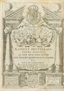 .1651.. LIBRO: .(LITERATURA HEROICA).. .BORIA, FRANCISCO DE:. .POEMA HEROICO, NAPOLES RECUPERADA POR EL REI DON ALONSO.. Çaragoça: En el Real y General Hospital de nuestra señora de Gracia, 1651. 8º mayor. Frontis grabado + 16 h. (con la portadilla remontada) + 398 p. + 1 b. Texto en doble marco. Cerco de humedad en primeras y últimas hojas. Enc. en pergamino, lomera rotulada. Ex-libris. Primera edición. Palau 33126.