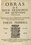 .1729 y 1658.. LIBRO: .(LITERATURA).. .QUEVEDO Y VILLEGAS, FRANCISCO DE:. .OBRAS.. Madrid: Pedro Joseph Alonso de Padilla, 1729. 8º mayor. Primera parte: 5 h. + 608 p. Texto a dos columnas Papel muy tostado. Algunos errores de paginación pero texto...