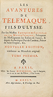 .1755.. LIBRO: .(MITOLOGÍA-LITERATURA).. .SALIGNAG DE LA MOTTE FENELON, FRANÇOIS:. .LES AVANTURES DE TELEMAQUE. FILS D´ULYSSE.. Paris: Chez les fretes Estienne, 1755. 8º. 4 h. (frontis, portada) + XLVII + 386 p. + 11 lám. calcográficas. Portada a dos tintas. Texto con apostillas marginales. Pequeña galería en el margen inferior interno, no afecta texto. Alguna manchita de tinta de época. Enc. en pasta española muy rozada, lomera cuajada, nervios, doble tejuelo, cortes pintados. Exlibris de anterior poseedor.