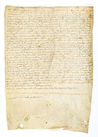 .1308.. MANUSCRITO: .(GIRONA).. .DOCUMENTO NOTARIAL REFERENTE A UN PERMUTA O CAMBIO DE DOS PIEZAS DE TIERRA.. Texto manuscrito en latín. 38 x 27 cm. Trueque de dos piezas de tierra entre Guillem Ramada y Arnaldo [Lopany] en la parrochia de Brunyola....