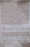 .1406.. MANUSCRITO: .(LA GARRIGA).. .MANUSCRITO SOBRE PERGAMINO REFERENTE A LA PARROQUIA DE STA. EULALIA RONSANA.. 60 X 40 cm. Joan Planell, payés de Sant Esteve de la Garriga, establece a Margarita, viuda de Benet Vilanova, de la Garrica, una pieza de tierra de dos cuarteras, parte yerma y parte boscosa. Situada en la Garriga en el lugar llamado Ridamilans, bajo el dominio del castillo de Centelles. Signum notarial de Joan Feu, notario de Santa Eulalia de Ronçana.