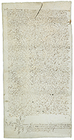 .1554.. MANUSCRITO: .(PERGAMINO-GIRONA).. .DOCUMENTO NOTARIAL REFERENTE A UN TESTAMENTO DE MICHAELIS DOMINGO.. Texto manuscrito en latín. 40 x 20 cm. Documento testamental de Michaelis Domingo a su hija Narcisa. Signum notarial dado en Girona en 1554. Pequeña rasgadura en el margen inferior, sin pérdida.